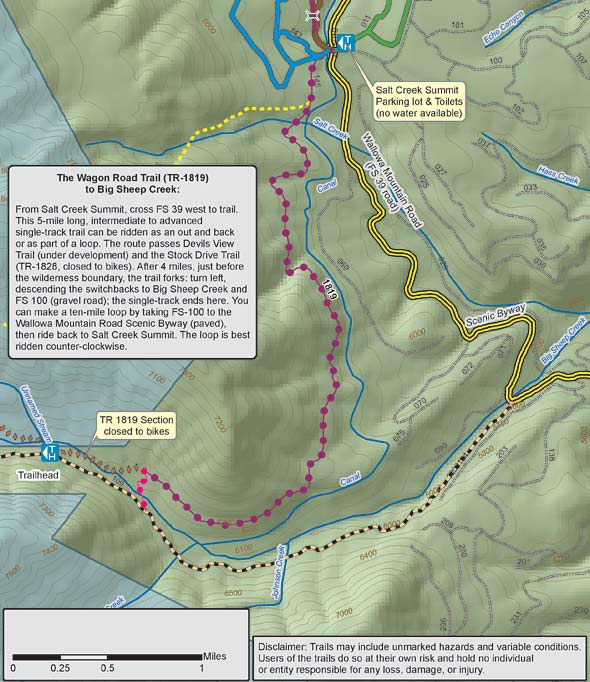 The Wagon Road Trail (TR-1819) to Big Sheep Creek: From Salt Creek Summit, cross FS 39 west to trail. This 5-mile long, intermediate to advanced single-track trail can be ridden as an out and back or as part of a loop. The route passes Devils View Trail (under development) and the Stock Drive Trail (TR-1828, closed to bikes). After 4 miles, just before the wilderness boundary, the trail forks: turn left, descending the switchbacks to Big Sheep Creek and FS 100 (gravel road); the single-track ends here. You can make a ten-mile loop by taking FS-100 to the Wallowa Mountain Road Scenic Byway (paved), then ride back to Salt Creek Summit. The loop is best ridden counter-clockwise.